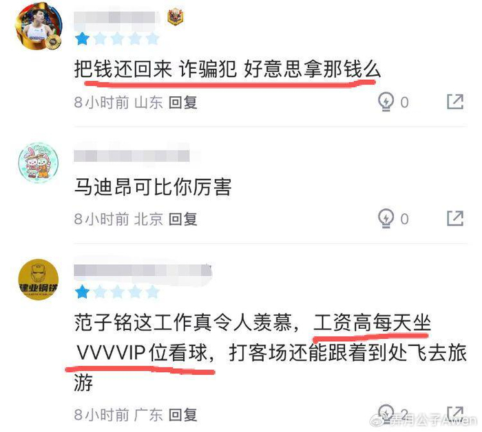 全场比赛,拿着600万年薪的范子铭0分0板0助0帽0断,所有数据统计只有1次被盖和2次犯规,正负值-5,真是惨不忍睹。有球迷直言:诈骗犯,好意思拿那么多钱?